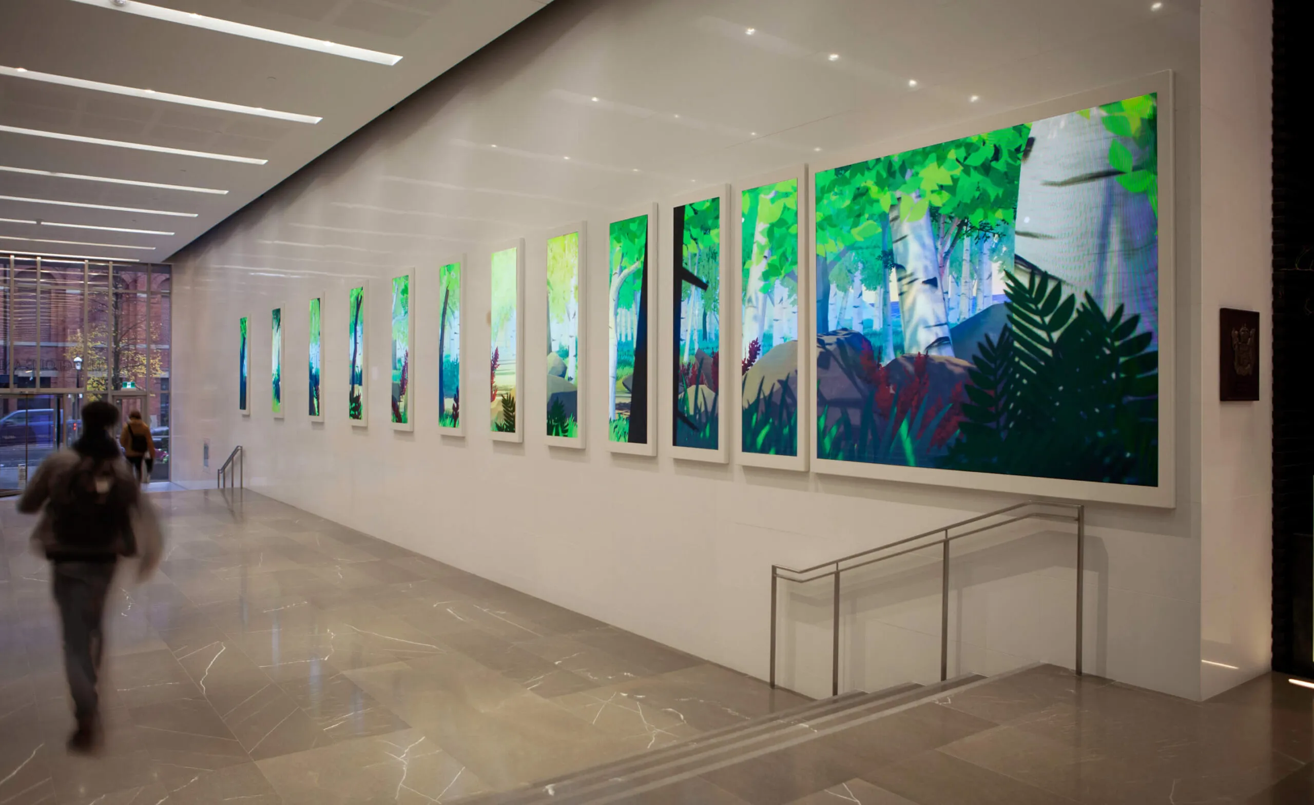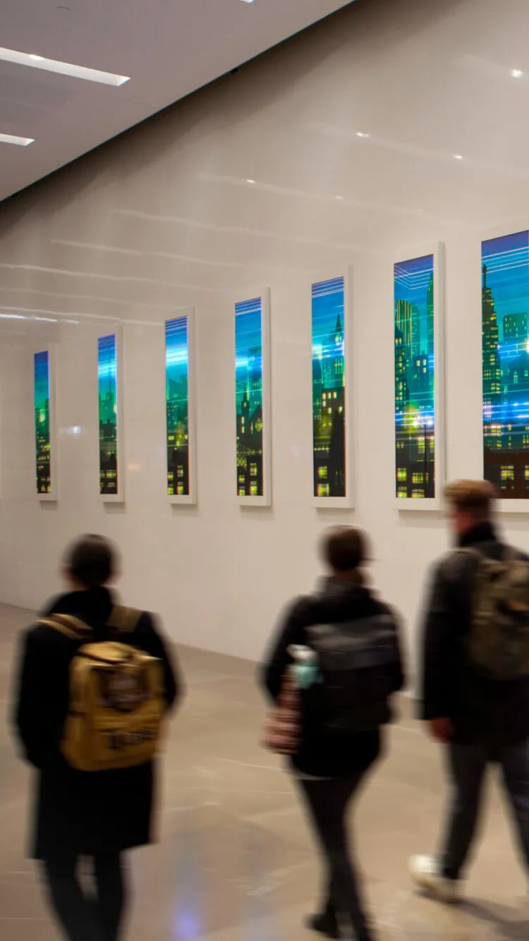 We created an array of LED columns across the 70-foot lobby wall, giving it the appearance of a series of growing ‘windows’ from the core of the building to the entrance. This extensive canvas creates two interactive artworks that attract attention while capturing and utilizing the constant pedestrian flow to affect the content.