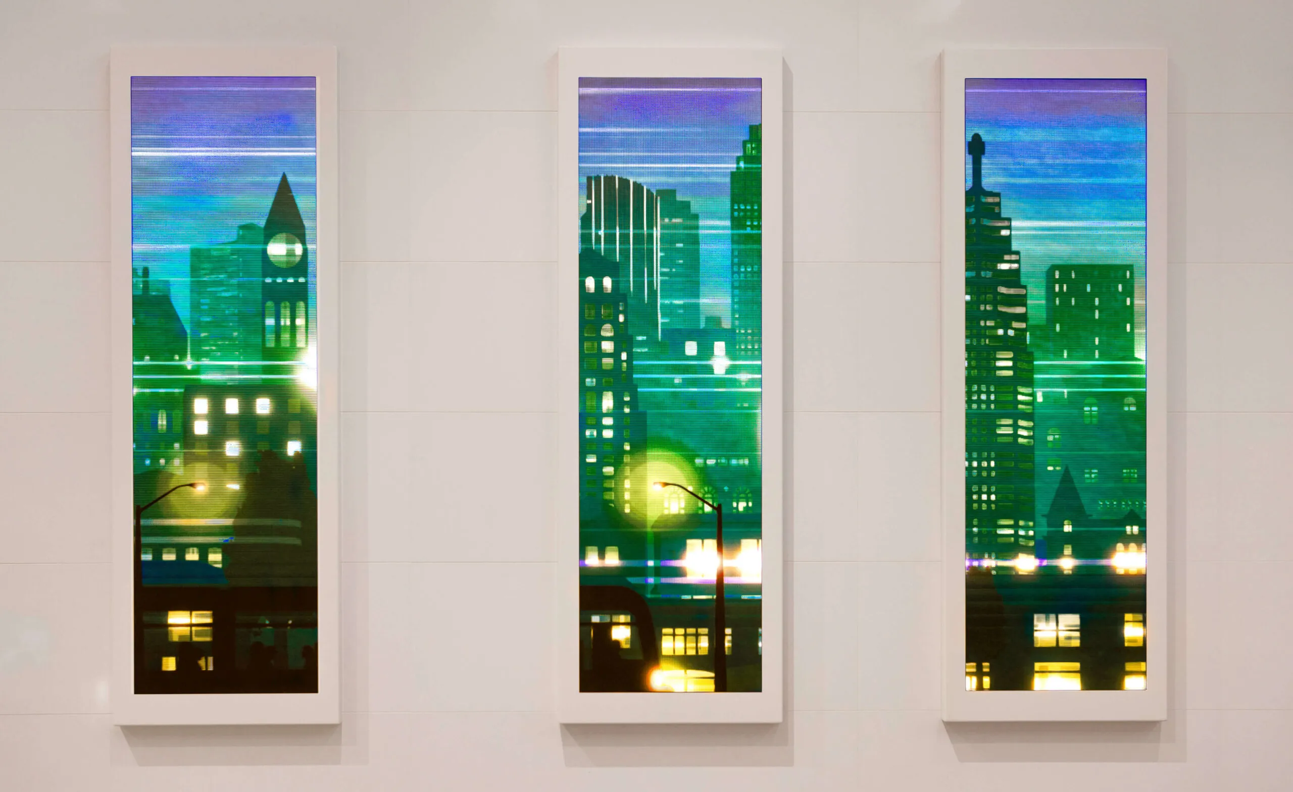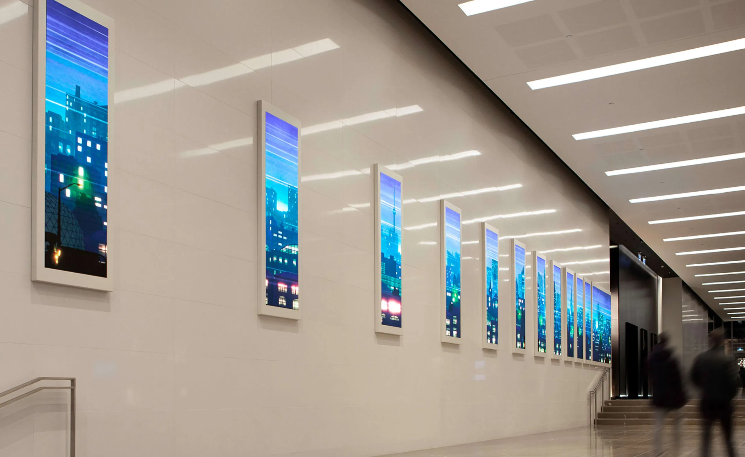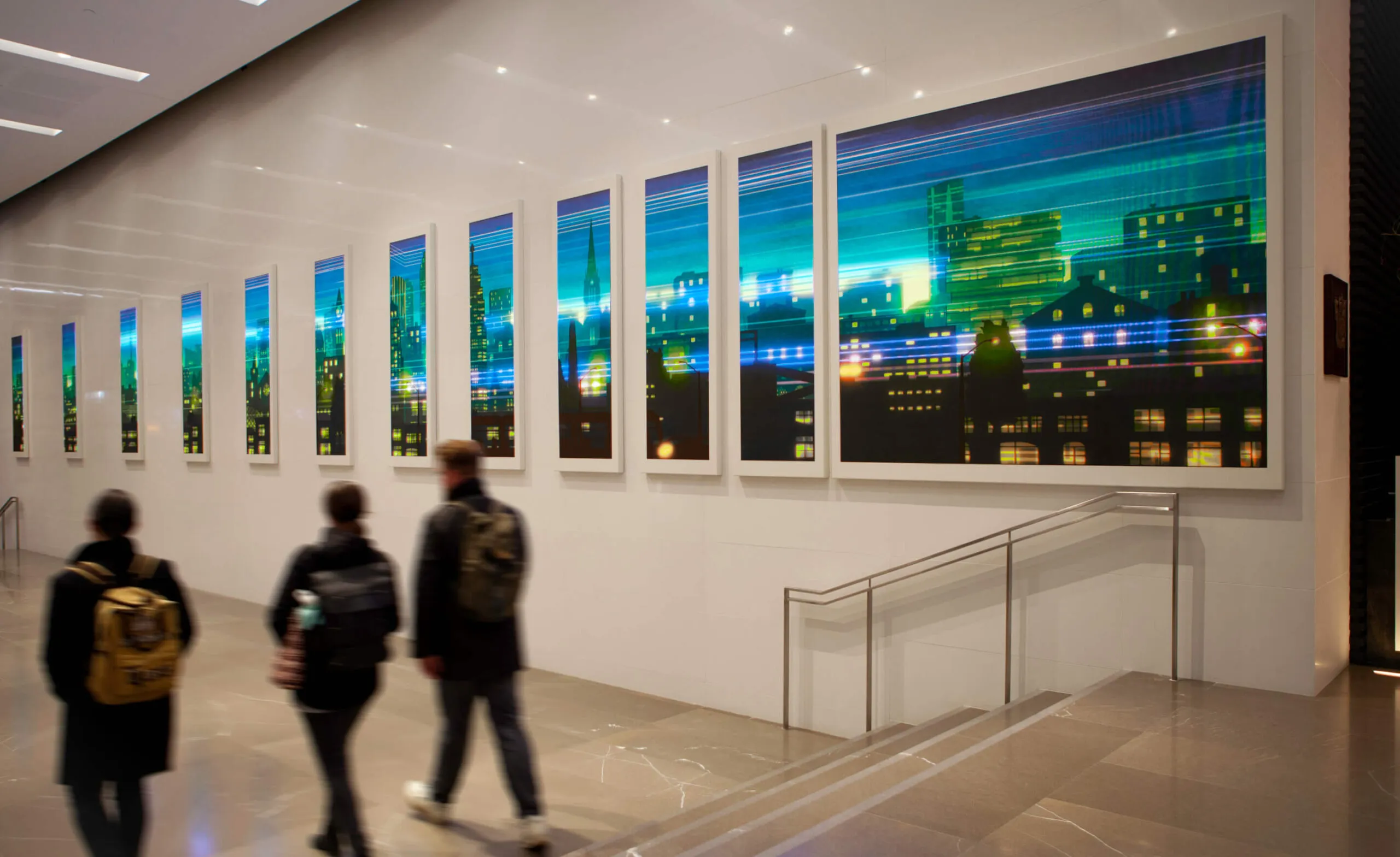 ‘Interstitial Space’ explores the symbiotic relationship between the city and its citizens. The piece actively translates the momentum of the lobby’s pedestrians, adding colourful lines that weave throughout the illustrated cityscape, revealing depth and imbuing energy into the art. Over the day, eight distinct eras celebrate the history of Toronto, from its humble beginnings in 1793 to its current vibrant state.
